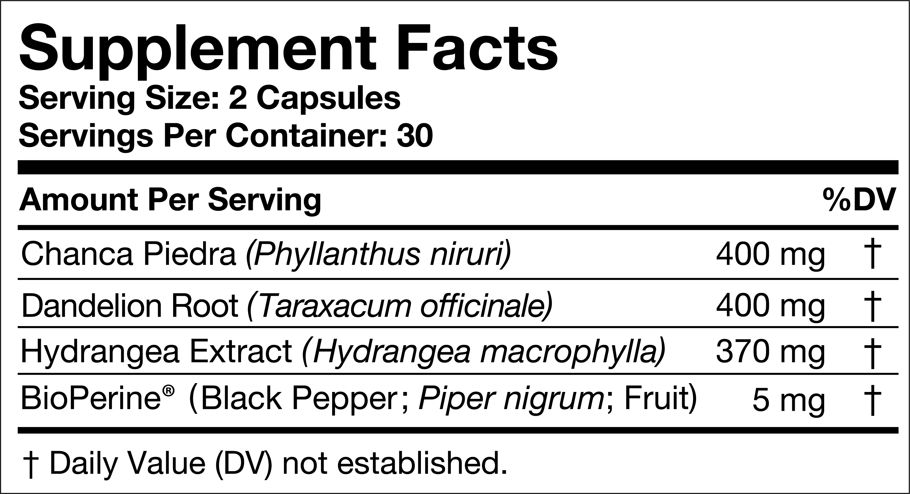 Our dietitian formulated this supplement with 400 mg of Chanca Piedra, 400 mg of Dandelion Root and 370 mg Hydrangea extract, to give you the maximum efficacy within the safety range based on different clinical studies.